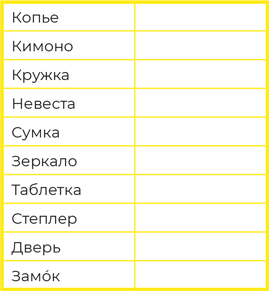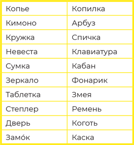 Задание-монстр: проработайте следующий список слов (просто читайте слово и представляйте его в своем воображении с разных сторон): компьютер, колонка, шкаф, вилка, валик, машина, велосипед, собака, ручка, кошелек, ваза, открытка, бутылка, кролик, цветок, расческа, мяч, резинка, коробка, спичка.