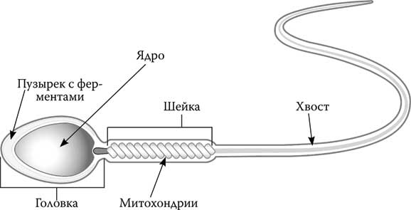 Сперматозоиды – самые настоящие почтальоны. Смысл их существования и единственная жизненная цель заключаются в том, чтобы доставить к яйцеклетке посылку – отцовский генетический материал. Природа наделила сперматозоид органом движения – длинным хвостом, который часто называют «жгутиком», и «ключом», позволяющим проникнуть в яйцеклетку – ферментами, которые растворяют оболочку яйцеклетки. Эти ферменты «упакованы» в пузырек, называемый «акросомой». В головке сперматозоида нет ничего, кроме ядра с хромосомами и акросомы. Цитоплазмы, полужидкой клеточной среды, сперматозоиды лишены потому что им надо быть как можно легче, чтобы двигаться как можно быстрее. Единственное, что кроме ядра и акросомы есть у сперматозоида из клеточных органов, – это митохондрии, клеточные энергетические станции. Они расположены в шейке сперматозоида, между головкой и хвостом. Митохондрии снабжают хвост энергией, необходимой для движения.