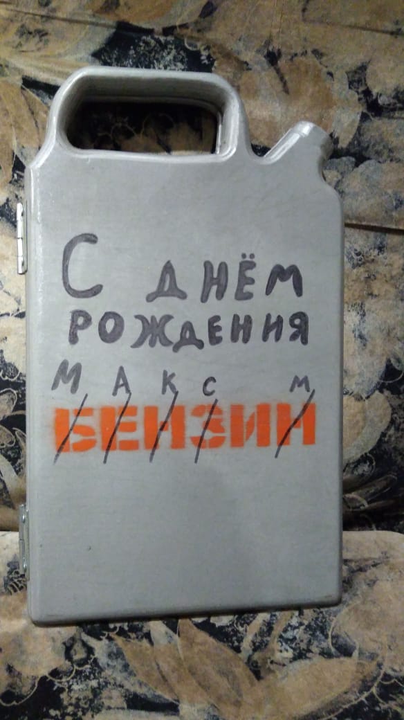 Другому другу, водителю, подарил «канистру». Нашёл кусок фанеры (18 мм), из неё и вырезал. Откопал его прикольную фотку, нашёл стих, распечатал и прибил гвоздями с красивыми шляпками. Конечно, вес «канистры» был в 2 раза меньше, но принцип тот же. НЕЗАБЫВАЕМО!!! Закрывалась «открытка» на "замок", подходящей по размеру пластмассовой крышечкой. Крышка потерялась сразу же, во время гулянки. Моя промашка. Надо было прикрепить её на цепочку.