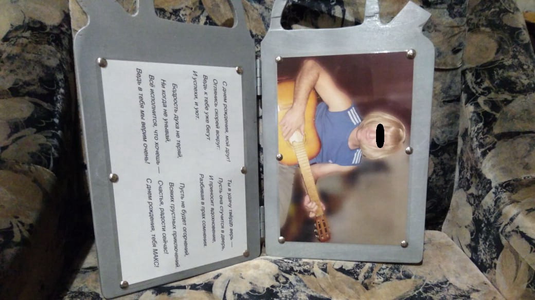 Первый мой подарок был сделан для друга столяра. Открытка из 4-хсантиметровой фанеры, с размерами примерно 40 на 25 сантиметров, что бы лист формата А4 не вылезал за края. Что бы «открытка» открывалась, скрепил двумя шарнирами от межкомнатных дверей. Нашёл интересный стишок, распечатал, заламинировал и прикрутил шурупами внутрь «открытки». Весила она килограммов 8-10. Такая ОТКРЫТИЩА не забудется никогда!!!