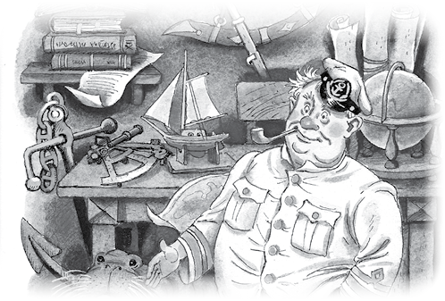 Вместо скромного отставного аптекаря за столом, углубившись в чтение какой-то древней книги, сидел грозный капитан в полной парадной форме, с золотыми нашивками на рукавах. Он свирепо грыз огромную прокуренную трубку, о пенсне и помину не было, а седые, растрепанные волосы клочьями торчали во все стороны. Даже нос, хотя он действительно и покраснел, стал у Врунгеля как-то солиднее и всеми своими движениями выражал решительность и отвагу.