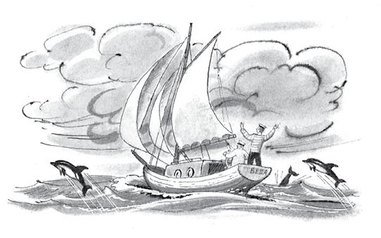 Идем. Тишина, только волны шелестят вдоль бортов, мачта поскрипывает, а берег уходит, тает за кормой. Погода свежеет, белячки пошли по волнам, откуда-то прилетели буревестники, ветерок стал крепчать. Работает, свистит в снастях настоящий морской соленый ветер. Вот и последний маяк остался позади, берегов как не бывало, только море кругом; куда ни взглянешь – везде море.
