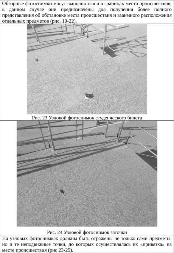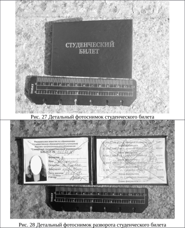 – Потом предмет или след фотографируют по правилам детальной фотосъемки, – продолжила девушка, – рядом с ним кладут масштабную линейку (рис. 23). Она нужна для того чтобы по фотографии можно было определить размерные характеристики объекта. Первый раз предмет фотографируют в том виде, в каком его нашли (рис. 23—24). Затем предмет может быть перенесен в более удобное место, осмотрен и сфотографирован в разных видах или с разных сторон. Например, на месте происшествия мы нашли студенческий билет в закрытом состоянии. Мы его фотографируем по правилам детальной фотосъемки в закрытом состоянии, там, где нашли. Потом переносим на лист бумаги и фотографируем, сначала в закрытом состоянии, потом разворот (рис. 25), потом обратную сторону, и можно обложку в раскрытом положении, и все снимки делаем с масштабной линейкой.