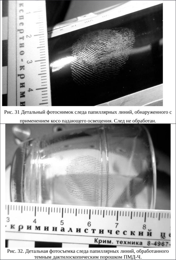– Если на месте происшествия обнаружены следы пальцев рук, – начал Сергей, но увидев, что следователь нахмурился, а Серафима подняла бровь, поправился, – точнее папиллярных узоров, они фотографируются по правилам детальной фотосъемки (с масштабной линейкой) не менее трех раз. Сначала в том виде, в каком были обнаружены (рис. 28), второй раз после обработки порошками или реактивами (рис. 29), третий раз фотографируют дактопленку, на которую откопирован след (рис. 30).