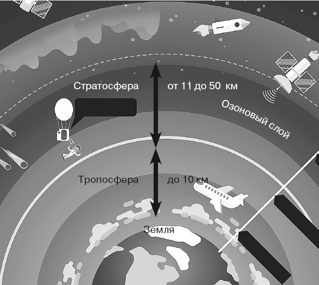Над тропосферой на высоте от 11 до 50 км расположена стратосфера. Здесь находится озоновый слой или «озоносфера», состоящий из озона – трехатомной модификации кислорода (О3). Озоновый слой поглощает коротковолновую часть ультрафиолетового излучения Солнца, которая губительна для всего живого. Жизнь на нашей планете смогла выйти из воды на сушу лишь после того, как был образован озоновый «щит». Выше озонового слоя никакой жизни не существует. Озон можно обнаружить на высоте от 15 до 60 км, но максимальная концентрация его наблюдается на высоте 25–35 км.