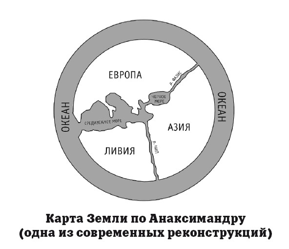 Земля в представлении Анаксимандра была плоской и круглой, этакий блин, окруженный мировым океаном. Центром Земли древние греки считали город Дельфы в котром хранился священный камень, называемый «омфалом» или «пупом Земли».