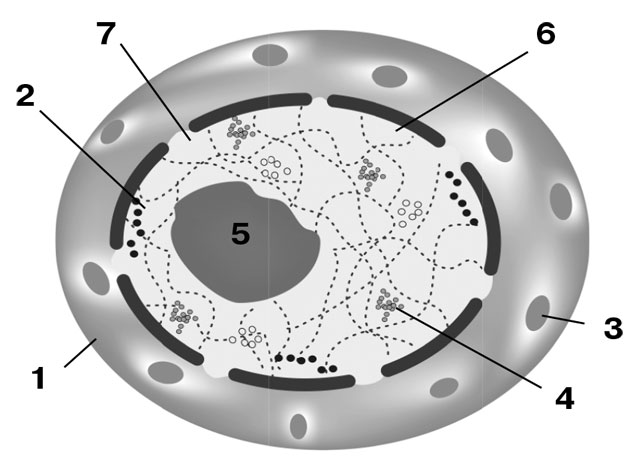 Строение клеточного ядра: 1 – наружная ядерная мембрана; 2 – внутренняя ядерная мембрана; 3 – рибосомы; 4 – хроматин; 5 – ядрышко; 6 – кариоплазма; 7 – ядерная пора