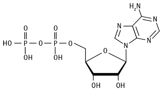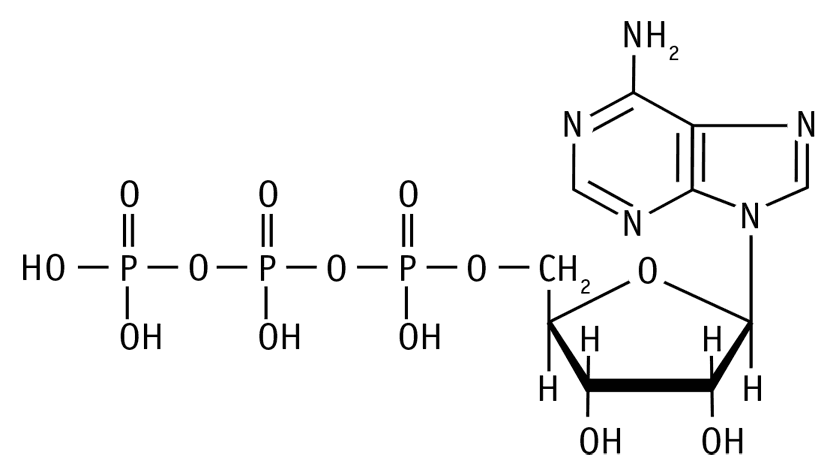 Энергия высвобождается при гидролизе[8] АТФ, когда от молекулы последовательно отщепляются остатки фосфорной кислоты (на формуле они видны слева). При отщеплении концевого остатка фосфорной кислоты АТФ переходит в аденозиндифосфорную кислоту (АДФ), при отщеплении второго остатка фосфорной кислоты – в аденозинмонофосфорную кислоту (АМФ).[9]