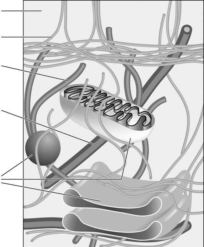 Основное вещество цитоплазмы, называемое гиалоплазмой,[11] представляет собой бесцветную коллоидную среду, состоящую из воды, молекул органических веществ и ионов. Гиалоплазма создает необходимую среду для протекания биохимических реакций, хранит клеточные запасы, участвует в поддержании постоянства внутреннего состава клетки и в транспорте веществ. Гиалоплазма эукариотических клеток пронизана многочисленными белковыми микротрубочками и волокнами, совокупность которых составляет клеточный скелет – цитоскелет. Цитоскелет обеспечивает пространственную организацию цитоплазмы, определяет распределение органоидов в клетке, способствует осуществлению всех типов клеточного движения, а также принимает участие в регуляции обмена веществ.