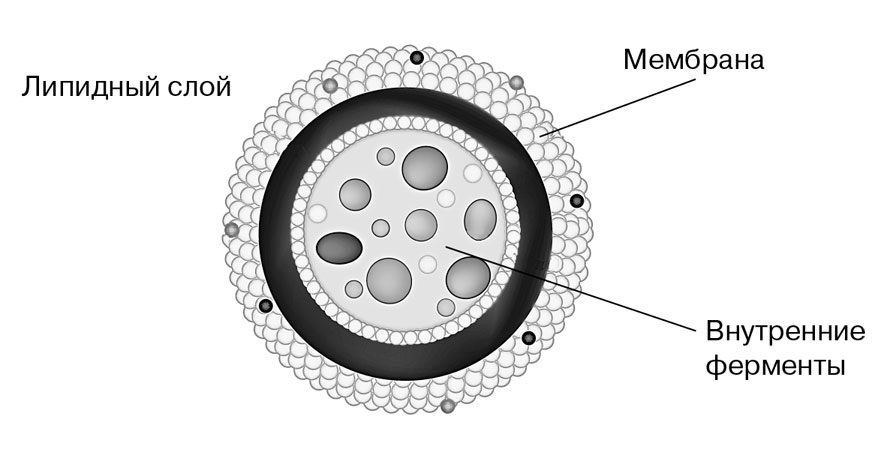 Клеточная мембрана состоит из двух фосфолипидных слоев. Гидрофильные «головки» обеих слоев обращены наружу и соприкасаются с водными растворами – межклеточной жидкостью и цитоплазмой, а гидрофобные хвосты обращены внутрь и словно бы связывают оба слоя. Жесткость мембране придает содержащийся в ней холестерин, который тоже является липидом.