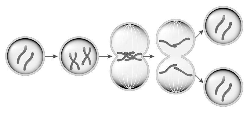 Каждая хромосома представляет собой одну молекулу ДНК. Хромосомы, имеющие вид длинных тонких нитей, собираясь вместе, образуют ядро клетки.