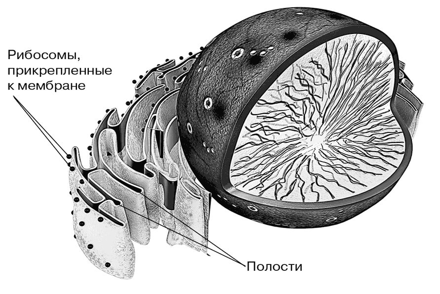 Шероховатая эндоплазматическая сеть или эндоплазматический ретикулум – это сложное сплетение каналов и полостей, своеобразная транспортная система клетки. На наружной поверхности шероховатой эндоплазматической сети располагаются рибосомы.