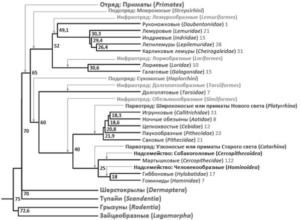 Генеалогическое дерево современных семейств приматов, а также родственных им отрядов млекопитающих.