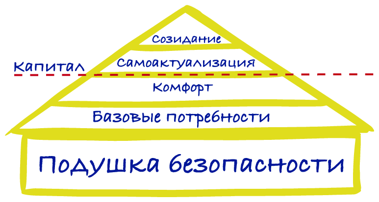 Но инвестору некогда скучать. Он занят сооружением крыши своего домика, капитала. Это могут быть акции, облигации, ценные бумаги, золото. В общем, любые активы, приносящие пассивный доход. Главное, чтобы их можно было в случае необходимости превратить в деньги. А пока же капитал начинает покрывать наши потребности, начиная с базовых по пирамиде Маслоу. Если фундамент, неприкосновенный запас, дает нам ощущение безопасности, то капитал позволяет повысить уровень требований к жизненному комфорту. Это – новая квартира, современная машина, отпуск в любой точке мира. В определенный момент человек понимает, что, если ему по карману такси, можно отказаться от поездок на трамвае. Дальше больше. По мере удовлетворения житейских потребностей меняется сознание капиталиста. Он задается все более «высокими» вопросами: чем бы я хотел заниматься, может, книгу написать или создать картину маслом? В чем, вообще говоря, мое предназначение в этой жизни? Ведь для чего-то я родился? Могу ли я быть полезным другим людям, что оставлю детям, кроме денег? Без подобных размышлений жизнь превращается в некую сладкую вату. Она приятна на вкус, но много ее не съешь. Организму, как известно, требуется разнообразная пища, то же касается и наших духовных потребностей.