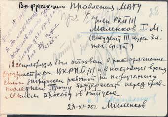 Заявление студента 3-го курса электротехнического факультета Г.М. Маленкова во фракцию правления МВТУ с просьбой о предоставлении отпуска в связи с загруженностью работой по поручению Орграспреда ЦК РКП(б). 28 ноября 1925