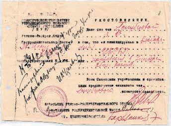 Удостоверение, выданное Учетно-распределительным отделом ПУРа Реввоенсовета В.А. Голубцовой в том, что она командируется в распоряжение ЦК РКП(б) для направления на факультет общественных наук 1-го Московского государственного университета. 27 июня 1921