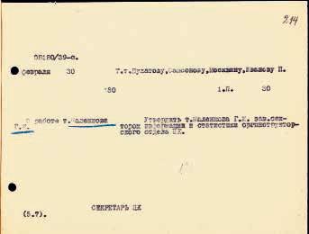 Постановление Оргбюро ЦК ВКП(б) об утверждении Г.М. Маленкова заведующим сектором информации и статистики Оргинструкторского отдела ЦК ВКП(б). 1 февраля 1930 [РГАСПИ. Ф. 17. Оп.113. Д. 819. Л. 214]