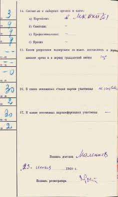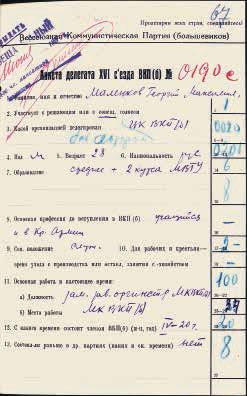 Анкета Г.М. Маленкова как делегата XVI съезда ВКП(б). 23 июня 1930