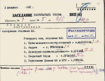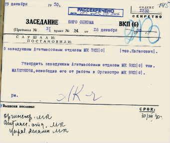 Выписка из протокола заседания Бюро Московского областного комитета ВКП(б) об утверждении Г.М. Маленкова заведующим Агитмассовым отделом МК ВКП(б). 28 декабря 1930