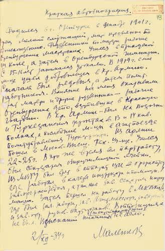 Краткая автобиография Г.М. Маленкова. 2 декабря 1934 Подлинник. Автограф Г.М. Маленкова. [РГАНИ. Ф. 3. Оп.62. Д. 128. Л. 43]