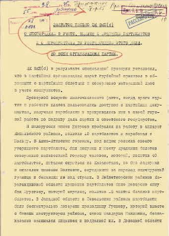 Закрытое письмо ЦК ВКП(б) о беспорядках в учете, выдаче и хранении партбилетов и о мероприятиях по упорядочению этого дела. (Утверждено Политбюро ЦК ВКП(б) 13 мая 1935 г.).