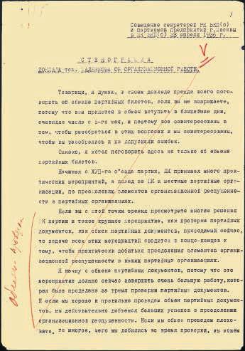 Времени на раскачку новый заведующий не получит – уже 23 апреля 1936 года он выступит с установочным докладом «Об организационной работе» на совещании секретарей райкомов и парткомов предприятий Москвы в Московском комитете ВКП(б). На самом деле, тем самым будет ускорена кампания по обмену партийных документов, за которой последует и чистка рядов. Фактически повторная проверка в ходе обмена документов будет носить совсем не формально-бюрократический характер. Перед секретарями и членами бюро райкомов будет поставлена задача «хорошо побеседовать с членом партии», «правильно поставить перед членом партии вопрос и добиться правильного ответа на этот вопрос»47. Одной из задач этой кампании Маленков назовет преодоление «элементов организационной распущенности в партийных организациях». Преодолеть «элементы расхлябанности и навести дисциплину», по Маленкову, означало «правильно поставить вопрос об отчетности и контроле за выполнением директив партии»48. Другую задачу Маленков сформулирует так: «…доделать то, что не доделали во время проверки [партдокументов. – А. С.], надо раскрыть чуждых людей…»49