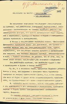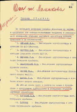 Докладная записка Г.М. Маленкова И.В. Сталину об аресте и исключении из партии за контрреволюционную деятельность заведующих областными отделами партийной пропаганды.