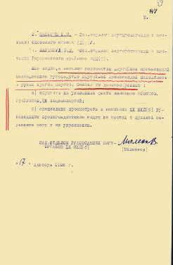 Подлинник. Машинописный текст. Подписи – автографы И.В. Сталина, В.М. Молотова, А.А. Андреева, А.И. Микояна, ГК. Орджоникидзе. [РГАСПИ. Ф. 17. Оп.163. Д. 1093. Л. 47]