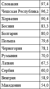 Национальные финансовые системы трех стран – Великобритании, Франции и Германии – продемонстрировали свою устойчивость, что не оказало существенного влияния на интегральные показатели потерь банковской системы Европы. По данным Европейского центрального банка, внутри зоны 16 членов ЕС ожидаемые потери от некачественных ценных бумаг на фондовом рынке и невозврата кредитов должны были составить 65 млрд. евро, а реальный объем потерь оказался 553 млрд. евро [European, December 9, 2009]. В гораздо более тяжелом состоянии оказались экономики стран, банковская система которых принадлежит уже зарубежным субъектам [Financial, October 13, 2008]. Список восточно– и южноевропейских стран, в значительной мере потерявших свой финансовый авторитет, представлен в табл. 1.