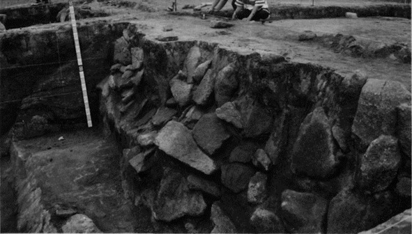 Расчистка полов жилищ. На переднем плане углубления металлургических печей и канавки от деревянных конструкций