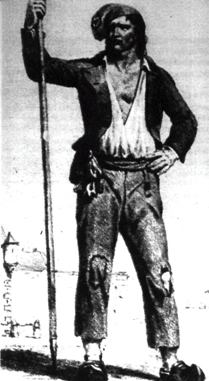 Révolutionnaire avec une lance. Gravure d'un artiste inconnu, 1793. Il porte sur la tête un bonnet phrygien à cocarde, il porte une chemise, un gilet court à manches carmagnole, un pantalon long matlo (matelots) et des sabots de bois (sabots). Kibalova L. – Gerbenova O., Lamarova M., Encyclopédie illustrée de la mode, Artia, imprimée en Tchécoslovaquie, 1986, p. 235.