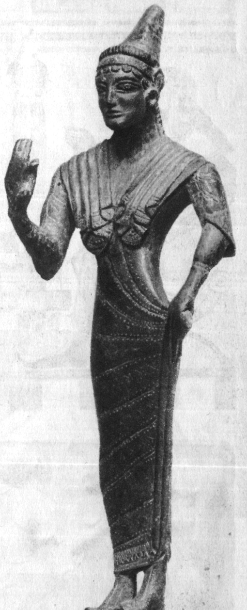 Этруски. Женская фигурка из Перуджи. Начало V века до н. э. Государственный музей. Берлин Женщина одета в прилегающую тунику, достигающую щиколотки, и короткий плащ. На голове у нее коническая шапка, напоминающая фригийский колпак, волосы заплетены. Кибалова Л. – Гербенова О., Ламарова М., Иллюстрированная энциклопедия моды, Артия, отпечатано в Чехословакии, 1986, с. 69.