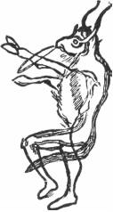 Images of hunters by an ancient man from the book by E. Tseren, "Biblical Hills", Moscow, Pravda Publishing House, 1986. Hunters, in order to catch an animal, put on its skins, made an imitation of hooves, horns, tails, masks or wings, so it was easier to catch any animal that perceived a person in the skin of this animal as its own. Hence came a variety of werewolves – people in the skin of animals, later actors (actors), priests and sorcerers who used various methods to establish their dominance over their tribesmen, including to become "human hunters", that is, to make tribesmen their slaves.