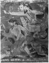 Detail of the painting of the "Blue Hall" of the Penjikent Palace, Tajikistan, depicts a fight with demons-divas, people who wear horns, goat beards and legs with hooves, two fierce demons, pulling bows, whirl into battle on a winged chariot, that is, artificial wings are attached to the chariot, 5-8 centuries.;