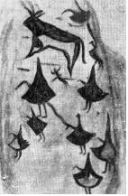 A sorcerer in the skin of a bull, drawing from the cave of the Three Brothers, Ariege, France, Upper Paleolithic;