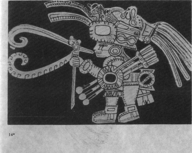 Il misterioso "guerriero di Teotihuacan". Il suo casco è dotato di fori per gli occhi; la tuta attillata e le scarpe insolite ricordano stranamente l'equipaggiamento di un medico epidemiologo.