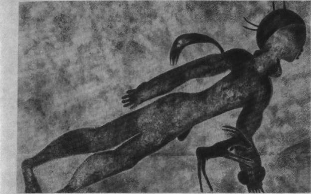 Affresco di Sefar (regione del Sahara vicino a Tassili). Nella parte superiore, una figura che ricorda un subacqueo o un medico con una tuta speciale. Sotto c'è un» marziano " o un uomo con una tuta protettiva.