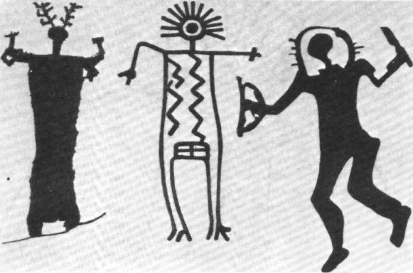 左边:来自Val Camonica(意大利北部)的牧师的身影。 他不是头上戴着天线的医生吗? 在中间:一个来自加利福尼亚州Inyo县的牧师的形象,也许也穿着防护服? 右边:Val Camonica岩画中的"宇航员医生"。