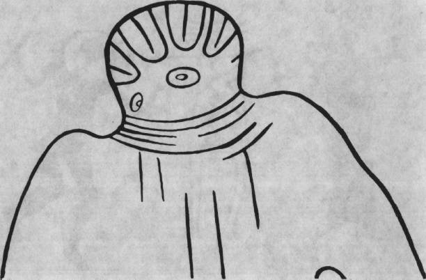 来自Sefar(Tassili附近的撒哈拉地区)的壁画。 顶部是一个类似潜水员或穿着特殊西装的医生的人物。 下面是一个"火星人"或一个穿着防护服的男人