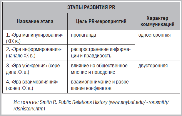 Обобщая американский опыт, экономист Р. Смит выделил четыре этапа в истории PR