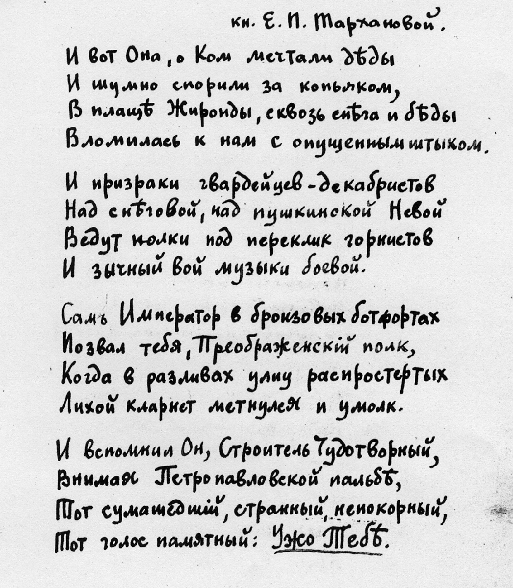 Автограф стихотворения П.Г. Антокольского с посвящением княгине Е.П. Тархановой. Рукописная поэтическая тетрадь, осень 1917. Хранится в фондах Литературного музея им. А.С. Пушкина, Вильнюс