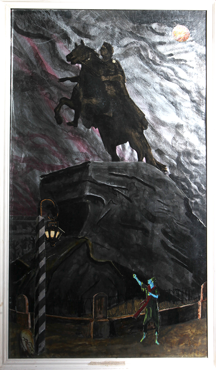 Медный всадник. Работа П.Г. Антокольского. Середина 1960-х106. Аппликация. Цв.тушь, гуашь, цв.бумага, фольга. Хранится в фондах Литературного музея им. А.С. Пушкина, Вильнюс