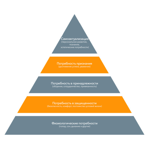 Для того чтобы понять, как потребности людей распределяются по уровням, можно воспользоваться всем известной Пирамидой Маслоу. С ее помощью автор смог расставить потребности человека в порядке от низших до самых высших. При этом нижняя и самая большая ступень отражает физиологические потребности: в пище, воде, сне и отдыхе. Голодный человек никогда не будет думать о более высокой потребности, так как его основная потребность еще не удовлетворена.