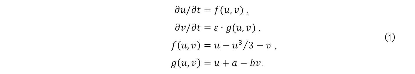 Для удобства читателя напомним, что моделью Бонхёффера—ван дер Поля называют динамическую систему, математическая запись которой в варианте, адаптированном к задачам электрофизиологии (часто в этом виде её указывают как модель ФитцХью—Нагумо), может быть представлена в следующем виде: