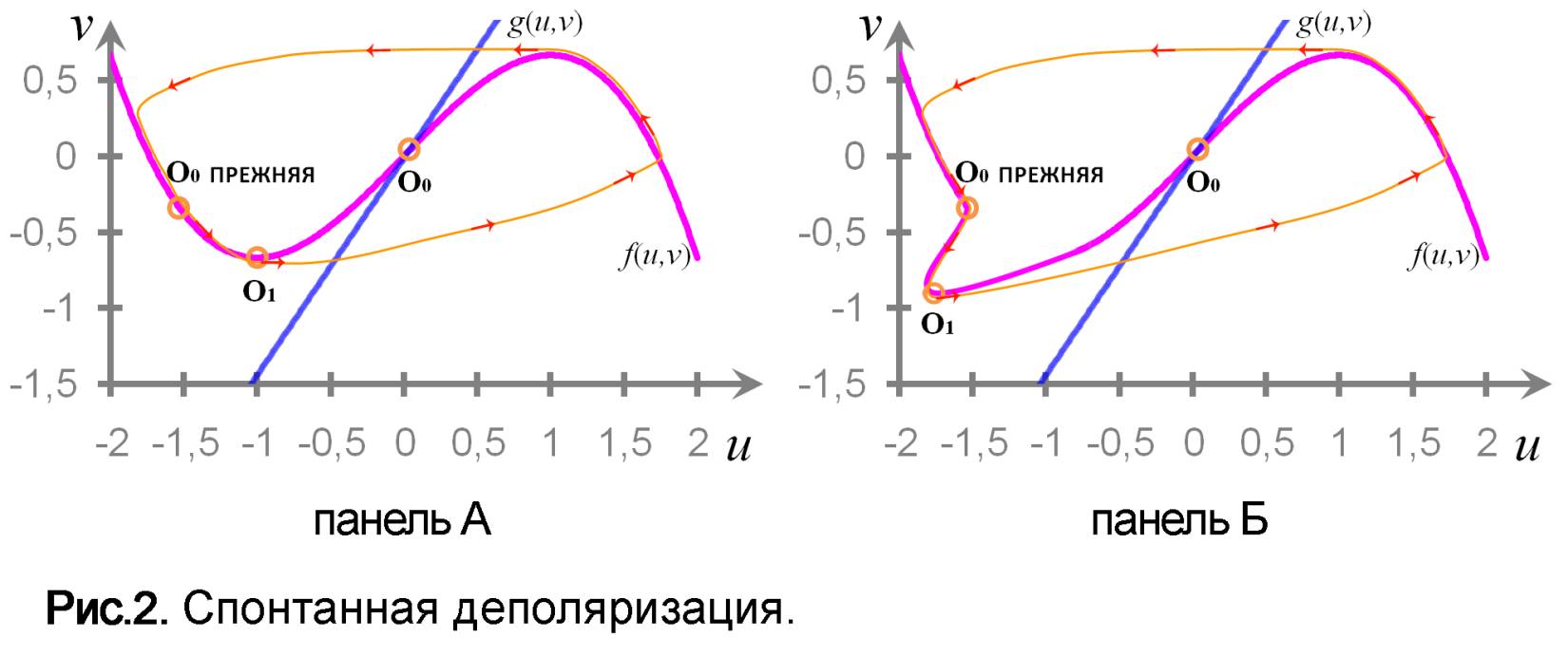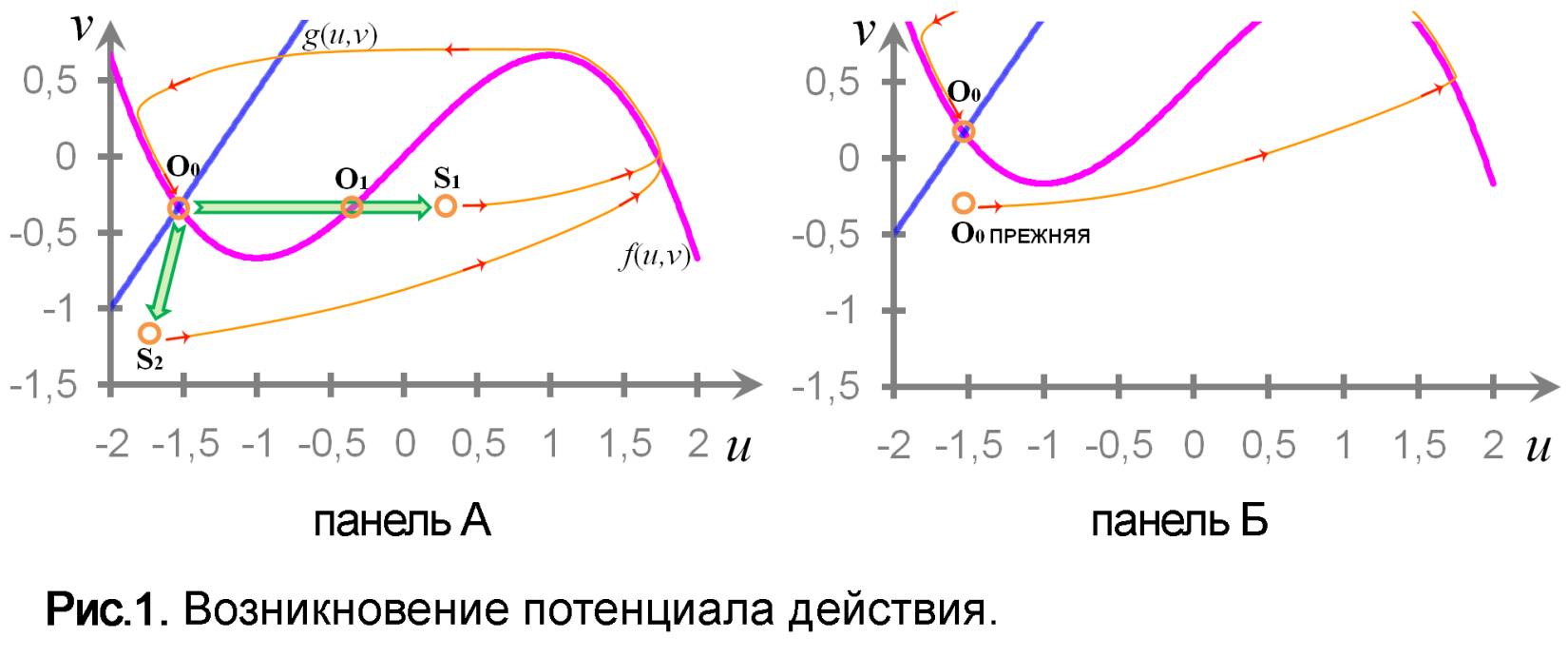 На рисунке 1.Б показан пример, когда положение нуль-изоклин скачкообразно изменилось, а состояние системы не успело измениться и всё ещё соответствует той же точке O0, – которая в условной норме совпадала с потенциалом покой, однако из-за произошедшего изменения свойств системы теперь оказалась в поле ненулевых фазовых скоростей (u, v).