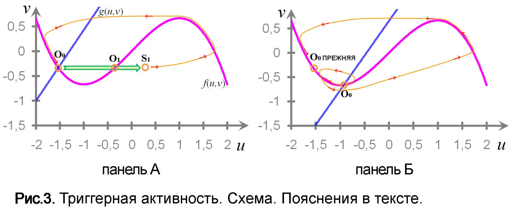 Здесь очередной ПД возникает (рис. 3.А) так же, как ранее было показано на рисунке 1.А, то есть под воздействием очередного стимула. Однако сопутствующие условия (перечисленные выше и традиционно указываемые в качестве «причины») приводят к тому, что точка O0, лежащая на левой ветви Z-образной нуль-изоклины при возникновении очередного ПД (рис. 3.А), смещается по левой ветви ниже в область перехода с левой ветви на среднюю часть Z-образной нуль-изоклины к моменту завершение «очередного» ПД, как это показано на панели Б рисунка 3. В этом новом положении точка O0 превращается в неустойчивый фокус, и фазовая точка системы, оказавшись (случайно ли или же в силу эволюции прежнего ПД) в её окрестности, станет по спирали раскручиваться, пока не выйдет на предельный цикл; последнее воспринимается в электрофизиологии как внеочередной ПД, обусловленный якобы «триггерной активностью». Таким образом, нарушается первый закон логики, потому как система в начале очередного ПД и при его завершении в данном случае не идентична сама себе; поэтому «порогового уровня» уже нет в момент завершения очередного ПД перед появлением внеочередного ПД. Указанная переходная область (рис. 3.Б) разделяет два разных режима автоволновой системы (кардиомиоцита в данном случае) – режим ожидания и режим автоколебательный; иными словами, в этой области находится точка бифуркации системы. По фундаментальной причине, известной как теорема о непрерывной зависимости движений системы в фазовом пространстве от параметров этой системы, в этой промежуточной области, то есть вблизи точки бифуркации системы, возникают явления так называемой задержки потери устойчивости (бифуркационной памяти). Простыми словами для этой конкретной бифуркационной ситуации наблюдаемое поведение системы можно описать так: система готова сорваться к правой ветви, как это происходит для автоколебательного режима (рисунка 2.А); однако она как бы «помнит» что чуть левее она была всё ещё устойчивой в режиме ожидания, – и потому перед тем, как уйти к правой ветви Z-образной нуль-изоклины, система совершает несколько оборотов вокруг точки бифуркации (как бы «в нерешительности топчется на месте»). Возможно также воспользоваться и иным пояснением: в точке O0 в данном случае (рисунка 3.Б) располагается стационарное решение типа неустойчивого фокуса, и потому фазовые траектории от него разбегаются по расходящейся спирали – это и выглядит в физиологических экспериментах как «триггерная активность». Сравните рисунок 3 и (1961, FitzHugh, Fig. 5). Эти несколько оборотов, отражающих фундаментальные свойства системы, физиологами и врачами наблюдаются как те самые «осцилляторные колебания потенциалов мембран». Далее, если параметры системы нормализуются самостоятельно после этого внеочередного ПД, то система снова возвращается в режим ожидания; иначе может наблюдаться на ЭКГ не одна экстрасистола, а их серия. Наблюдаемые же ионные токи в клеточных мембранах не обусловливают этот фундаментальный процесс, а лишь его сопровождают.