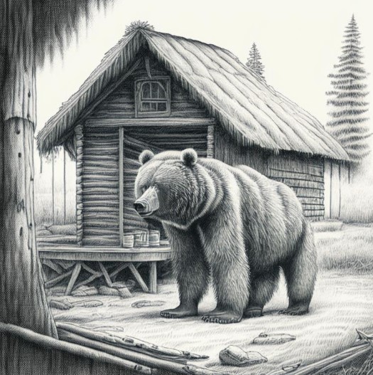 Медведь же издал рев и, пихнув нашу хижину еще разок, остановился, а затем постепенно двинулся прочь, довольно урча.