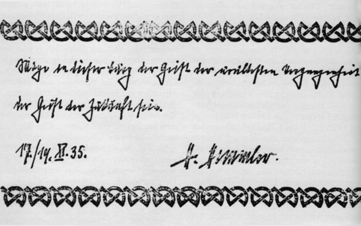 Автограф Гиммлера, сделанный 17 ноября 1935 года в специальном журнале для посетителей Вевельсбурга. Запись гласит: «Желаю, чтобы в этом замке дух древнейшего прошлого стал духом будущего»