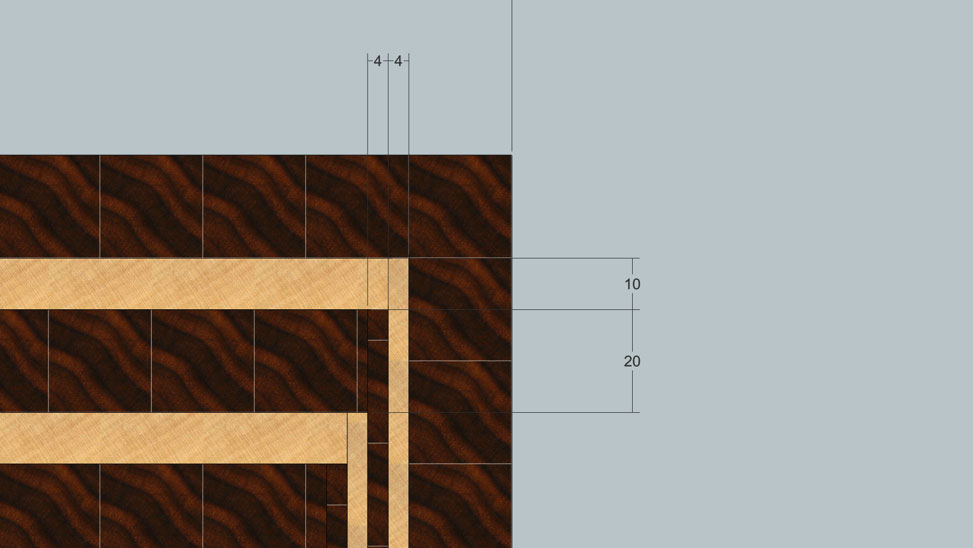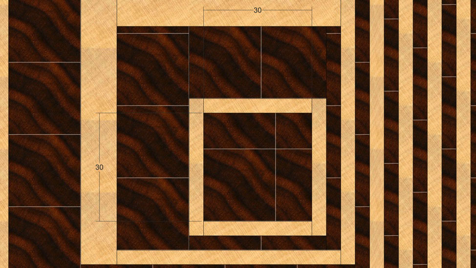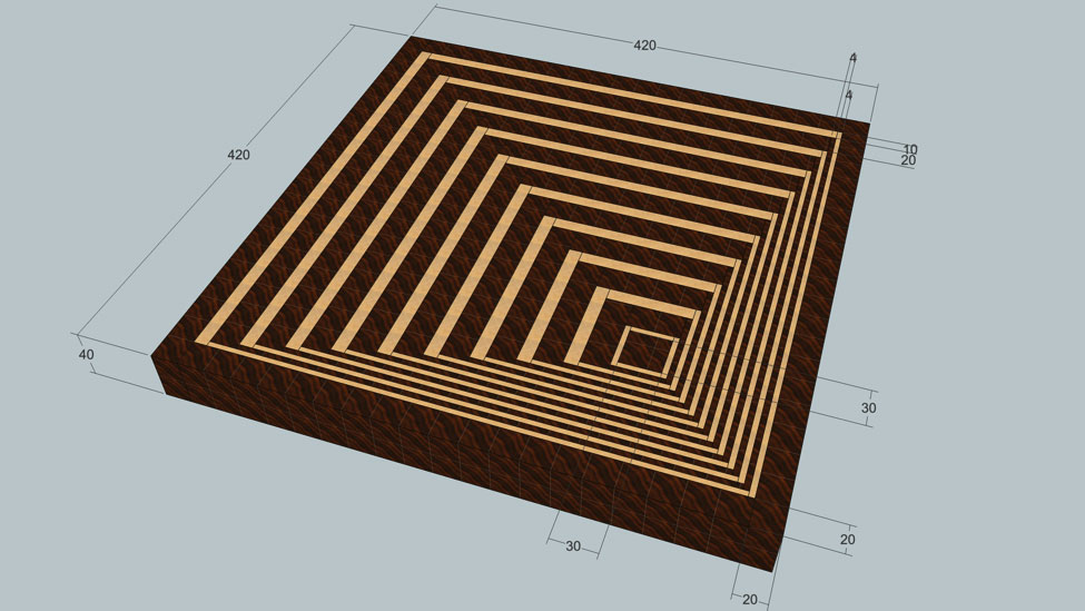 Вам понадобится один щит из сапеле толщиной 20 мм и длиной около 1200 мм. Можно сделать два щита по 600 мм, с длинными щитами работать неудобно. Полоски из этого щита будут использованы напрямую для формирования рисунка. Для получения 4 мм полосок нужно будет распилить 20 мм полоску вдоль на три части на ленточной пиле.