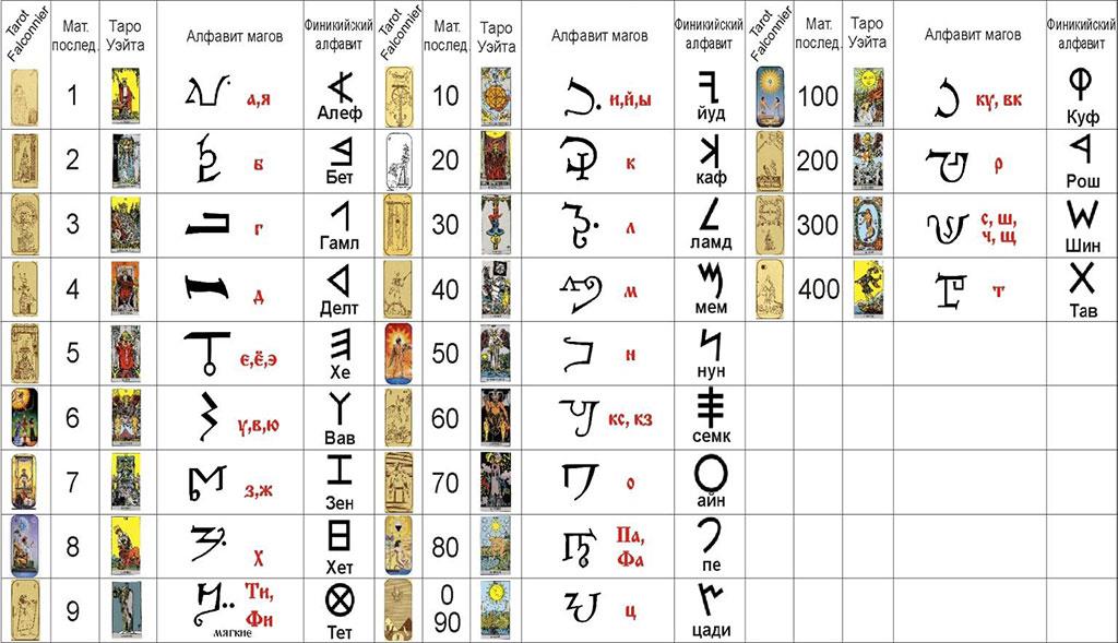 В 1896 году во Франции вышла книга Рене Фальконнье «Двадцать два герметических листа прорицательного Таро». Она была снабжена иллюстрациями Мориса – Отто Вегенера, как утверждал подзаголовок книги, «точно воссозданными по священным текстам, в соответствии с традицией Магов Древнего Египта». На изображениях Старших Арканов Египетского Таро, в правом нижнем углу, находятся буквы священного Алфавита Магов который стал базовым для многих алфавитов – в частности финикийскому. Каждая буква имеет цифровое и числовое значение, древние не разделяли цифровое и смысловое значения букв-цифр. В современном варианте карт это отображено в колоде Таро “Сильваны Алазии”. Оставим изображения каждой из букв для историков, для нас более важно смысловое значение Алфавита Магов связанное с математической последовательностью, на этом основана морфема-корень слова русского языка и это именно то, чего не понимали французы, так как русский язык не был для них родным. Доказательство происхождения морфемы-корня слов русского языка от Алфавита 22-х Старших Арканов Таро до наивности элементарно. Обратим внимание на «странную» математическую последовательность Таро Фальконье, где после девяти цифр идут числа 10, 20, 30, 40, 50, 60, 70, 80, 90, 100, 200, 300, 400, т. е. к цифрам прибавляется лишь ноль. Приведём данную систему к математическому порядку учитывая «странную» последовательность, т. е. буквы от 1-го Аркана до 9-го разместим вертикально, а все остальные буквы Старших Арканов разместим справа в соответствии цифрам к которым прибавляется ноль по мере увеличения чисел. Учитывая консонантный принцип в иератике и то, что некоторые русские слова читаются справа налево, например воз-зов или дев-вед, прочитаем цифры и числа: В порядке 2,20,200 – кара раба рака; 3,30,300 – голоса логоса чаша силы; 4,40,400 – дом дам дат там; 4 и 5,50 – день; 6,60 – сказка вкуса звука; 6 и 7,70 – воз зова; 8,80 – пах; 9,90 и 200 – цифра; 100 и 200 – кувырок; 200 и 300 – расы шара чары; 300 и 400 – сеть чёт; 50,40,30,20 – нам молока мил лик; 3,4,5 – где; 4,5,6 – дев, ев; 6,5,4 – вед; 1,2,3,4,5,6,7,8,9 – я раб бог гад где дев воз паха цифр.